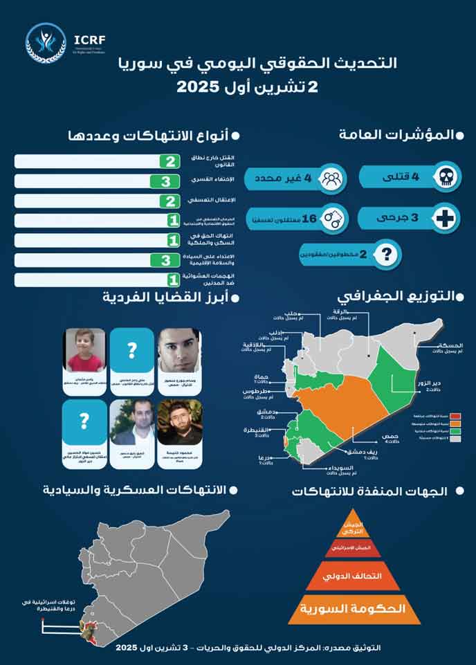 2 تشرين الأول , 2025 خاص الموقع عرض مصور - التحديث الحقوقي اليومي في سوريا في 2 أكتوبر 2025 "الحقيقة يجب أن تُروى" التحديث الحقوقي اليومي - 2 أكتوبر 2025 المصدر: المركز الدولي للحقوق و الحريات مشاركة:
